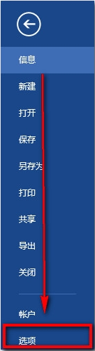 第一步、打开Word2013软件,点击文件菜单,在出现的文件菜单中,点击“选项”