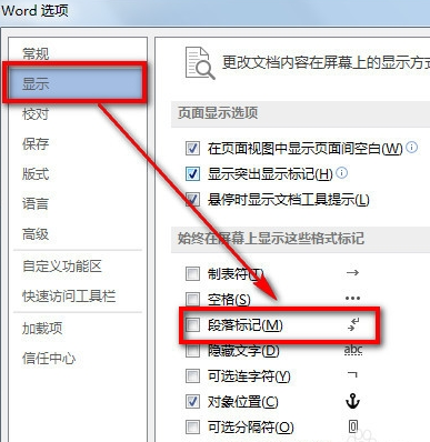 第二步、在Word选项界面,点击左侧“显示”选项,在右侧窗口,找到“始终在屏幕上显示这些格式标记”项目下,找到并取消“段落标记”后,点击底部确定按钮。