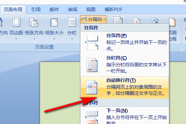 一、单击页面布局选项卡上的分隔符下的自动换行符命令即可,