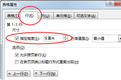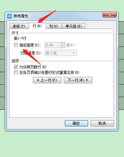4、进入“表格属性”,点击“行”,勾选指定高度前面的勾选框,输入需要的数字。