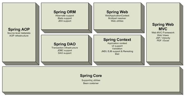 Spring框架由七个定义明确的模块组成,且每个模块或组件都可以单独存在,或者与其他一个或多个模块联合实现。Spring Core Container是一个用来管理业务组件的IoC容器,是Spring应用的核心;Spring DAO和Spring ORM不仅提供数据访问的抽象模块,还集成了对Hibernate、JDO和iBatis等流行的对象关系映射框架的支持模块,并且提供了缓冲连接池、事务处理等重要的服务功能,保证了系统的性能和数据的完整性;Sprnig Web模块提供了Web应用的一些抽象封装,可以将Struts、Webwork等Web框架与Spring整合成为适用于自己的解决方案。