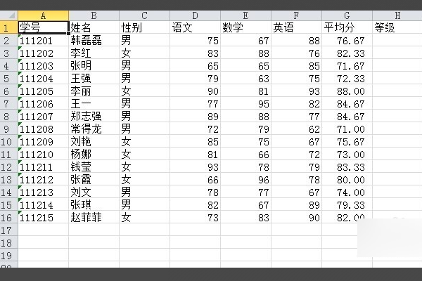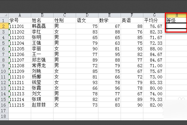 2、单击“等级”下的第一个单元格,这里是H2。
