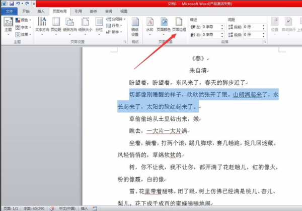 1、选择要设置边框和底纹的文字或段落,然后点击“页面布局”中的“页面边框”,如图: