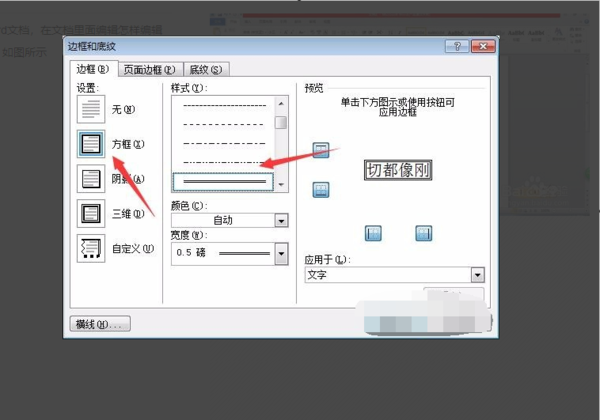 2、弹出边框和底色纹对话框,在这个对话框,可以对边框进行设置,如图所示。