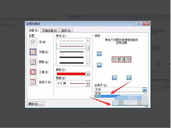 3、设置下选择方框,可选择一种线条颜色,边框颜色,边框宽度,应用于修改为段落,点击确定;
