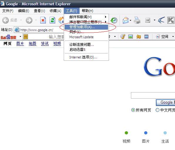 1打开IE网页浏览器--工具--管理加载项--选择IE以使用的加载项--点击下方所有带有Thunder的信息条--在下方点禁用--完成