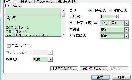 依次点击菜单栏的插入-引用-索引和目录打开索引和目录对话框,在对话框内选择索引选项卡,在对话框中根据自己的喜好或者论文的格式要求设置好索引的格式,最后点击确定即可。本文中使用的索引格式为“现代”,“缩进式”,分为两栏,以索引项的汉语拼音首字母作为排序规则。需要说明的是若要修改索引的格式,就只能选择“来自模板”,选择其他的格式则不可修改。