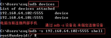 如果你连接当前电脑的手机不止一部时,这时就需要借助参数来进行选择指定的设备了。如下图: