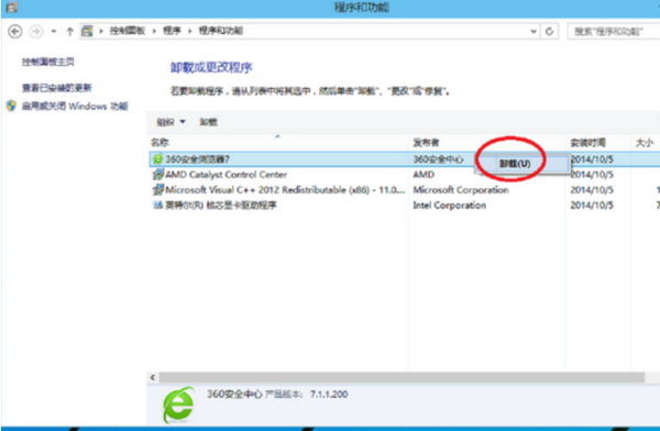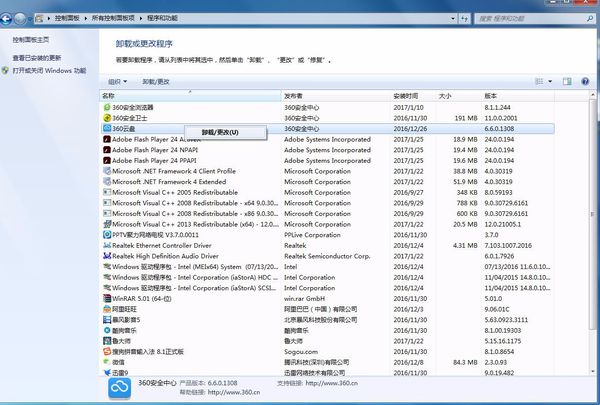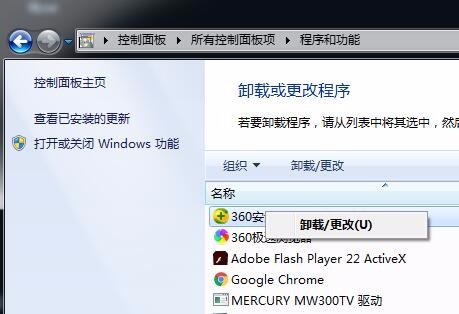 5、在卸载程序窗口,找到你需要卸载的程序软件,比如360安全卫士,在上面右击--卸载,单击卸载即可。