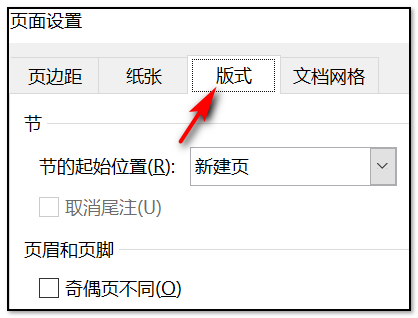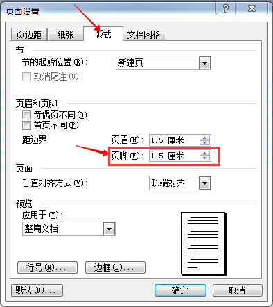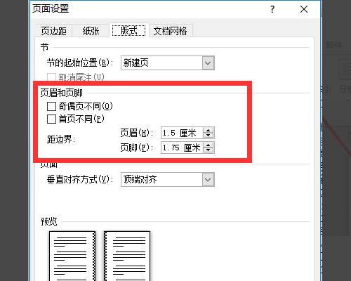 2、弹出页面设置对话框,选择版式选项卡,在页眉、页脚后面的输入框中输入所需要的数个即可,如图所示。