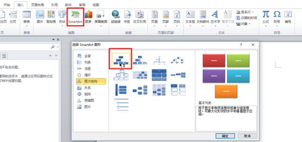 2.在弹出的“选择SmartArt图形”对话框中,选择“层次结构”选项卡,在中间的层次结构图中选择一种需要的图形,单击“确定”按钮。