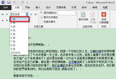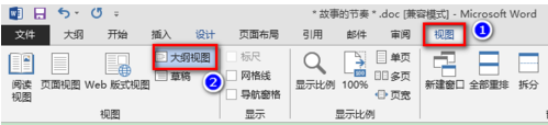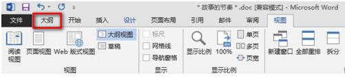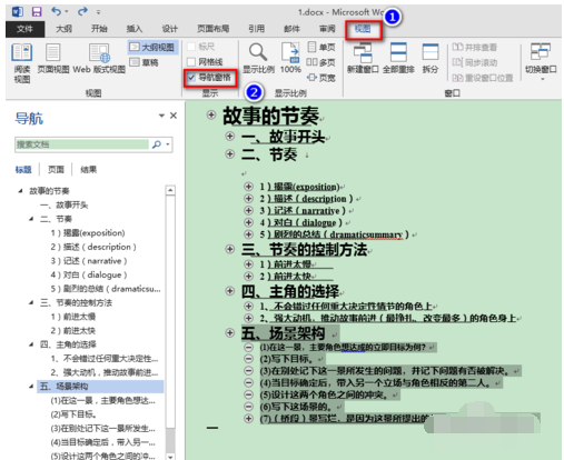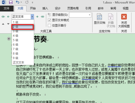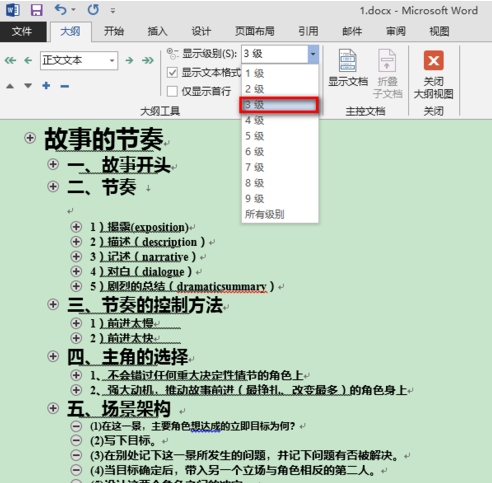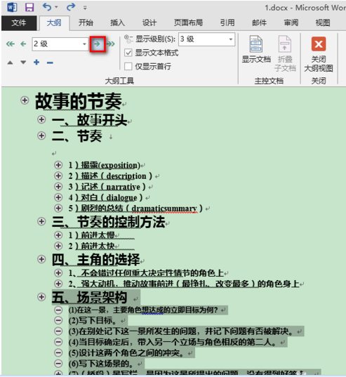 4、首先,确定树形视图的最顶层。在示例中,将鼠标移动到标题“故事的节奏”一行(该行任意一处均可),单击一下。然后在“大纲”菜单中的下拉框内选择 1 级。