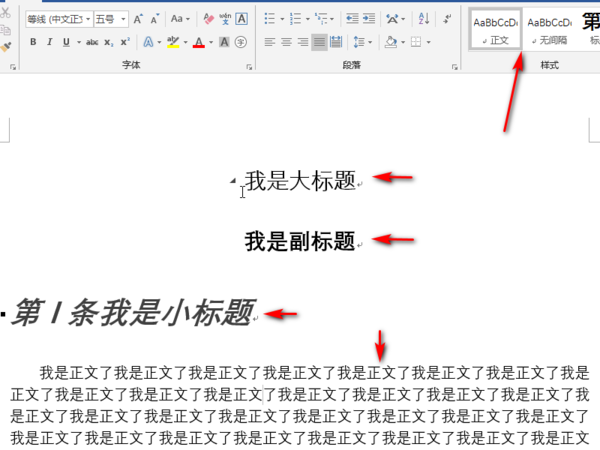 6、如果是做比较正式的文本,如标书、论文、调研书等篇幅比较长的文档,最好在编辑时就使用【样式】功能,即编辑标题时,点击【标题】,编辑正文时点击【正文】。这样即使后期需要修改格式,批量修改起来也更加方便。