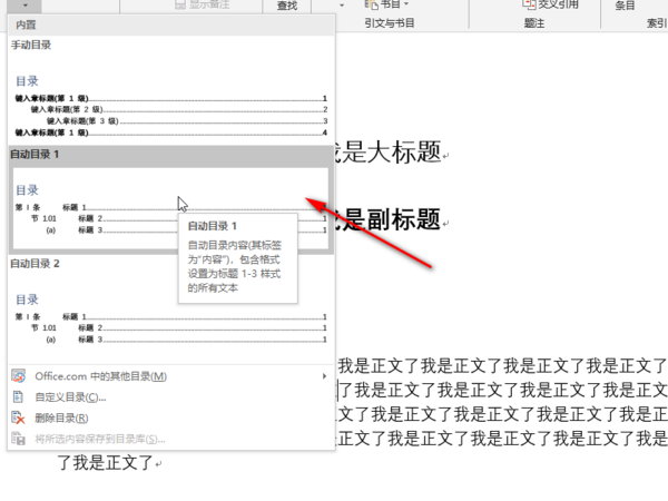 4、点击目录工具栏之后会弹出目录的内容选项,我们选择“自动目录1”,然后点击确定。