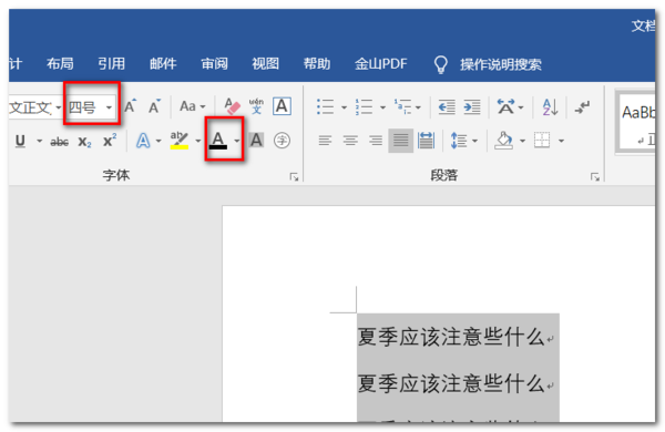 2、在工具栏找到字号按钮,将字号改为四号,找到字体颜色按钮,将颜色改为黑色。