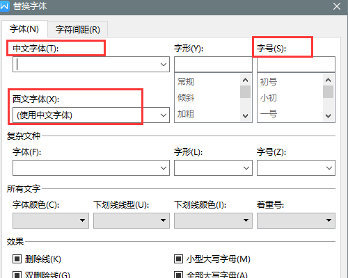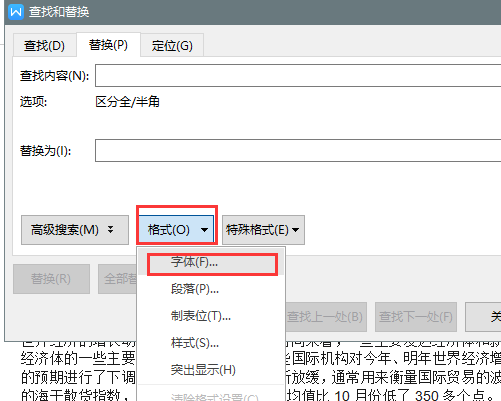 3、将鼠标移至替换为的部分,选择格式中的字体,打开