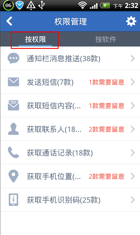 2、查看软件恶意行为。进入后即可按照【权限】或【软件】两种方式查看到各软件是否存在安全隐患,如图: