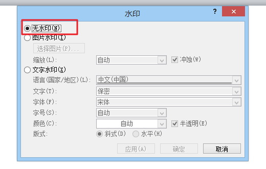 3、在水印对话框中选择“无水印”,然后单击“确定”,如下图所示。