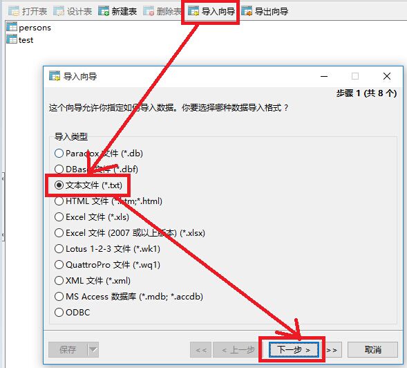 3、点击“导入向导”,弹出窗口选择“.txt文件”,然后点击下一步。