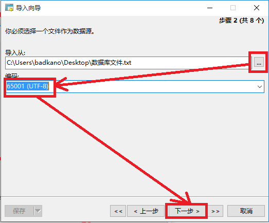 4、然后点击“...”选中文本文件的路径,编码一般选择UTF-8,然后点击下一步。