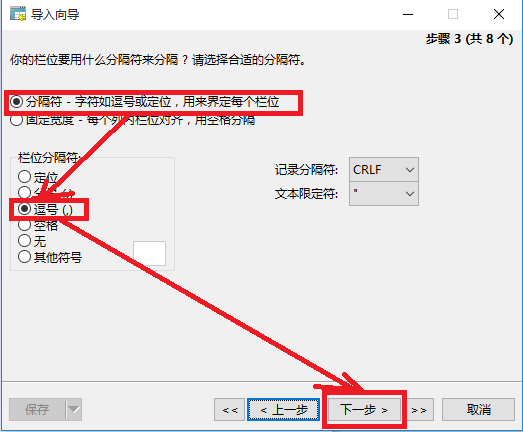 5、由于文件是文本格式并且逗号分隔,所以按照如图依次点击各按钮。
