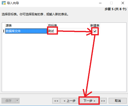 7、为目标表起个名字,如“测试”,并勾选“新建表”,然后点下一步。