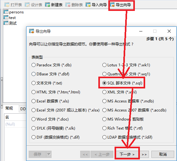 11、退出后,点击“导出向导”,然后选择“SQL脚本文件”,然后下一步。