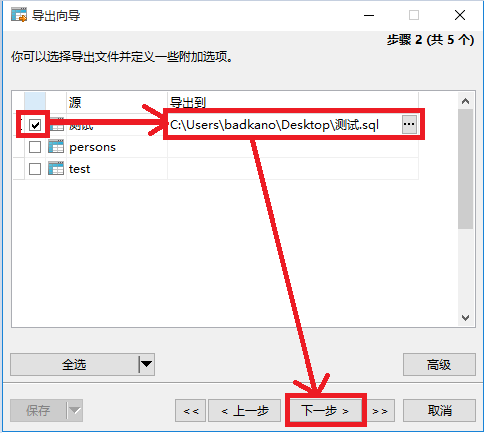 12、勾选要导出的表,然后选择导出路径以及起好导出的文件名,然后点“下一步”。
