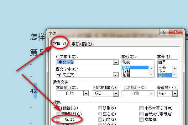 4、在字体设置界面选择设置字体下方的效果,在效果功能下方的上标前面的方框中打√。