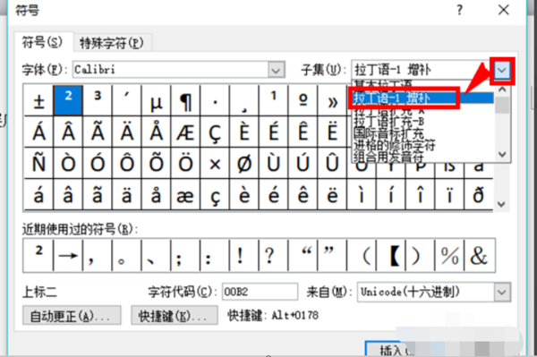 4、选择好字体之后,再点击【子集】后方的下拉箭头,在列表中点击选择【拉丁语-1 增补】选项。