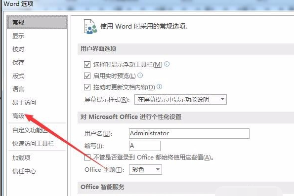 3、这时会打开Word选项窗口,点击左侧边栏的“高级”菜单