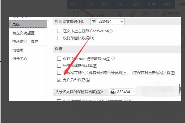 4、在右侧窗口中向下拖动滚动条,找到“允许后台保存”一项,取消前面的勾选,点击确定按钮