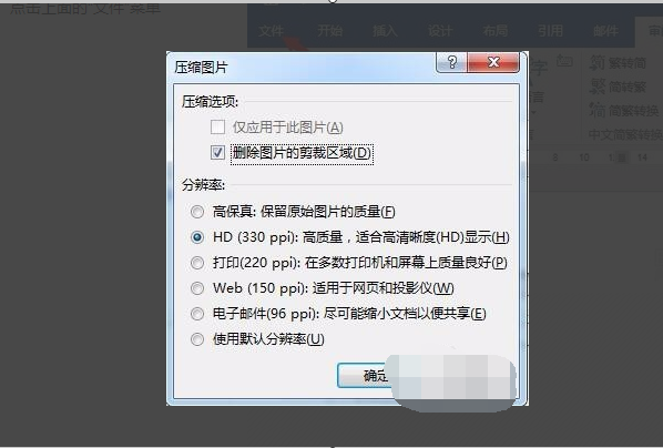 7、这时会弹出压缩图片窗口,在这里选择一个合适的分辨率,同时选中“删除图片的剪裁区域”前的复选框,点击确定按钮就可以了。