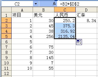 注意:我把你的汇率放到了D2,然后在公式中通过$D$2来引用这个汇率,你也可以直接在公式中输入8.34,不过若是汇率改变了,你需要重写公式而不是更新汇率。