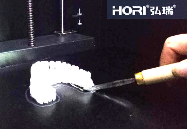 有时模型与平台粘得太紧,以至于用手难以将它移除。使用铲刀或撬棒能轻易地解决类似问题。将铲刀小心地伸到物体与平台之间的缝隙中,慢慢撬动,使模型底部逐渐松动起来,再将模型从平台取下。