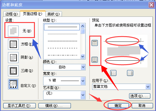 2、在“边框和底纹”对话框的“页面边框”标签页下,有两种方式:一是将边框设置成“无”,二是将继续使用“方框”,但要点击右侧预览中的“上线”和“下线”,使之切换为隐藏状态(可以在预览图中看到它们变成灰色)。最后单击此对话框右下角的“确定”即可。