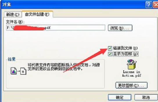 5. 然后点击浏览按钮,选中要插入的文件,比如pdf文件,然后勾选“链接到文件”和“显示为图标”这两项,为了确保之后的文档发送的时候,查看方便,word文档和要插入的文档最好在一个目录下