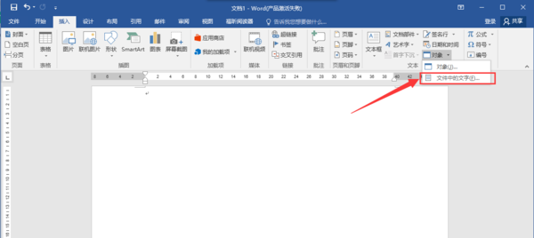 2、在“对象”的下拉菜单中,选择“文件中的文字”;