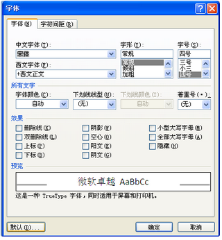 2、弹出字体对话框,在中文字体处选择宋体,单击默认按钮,如图所示;