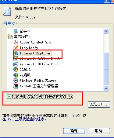 2、在弹出的窗口中,选择IE浏览器,勾选“始终使用选择的程序打开这种文件”;