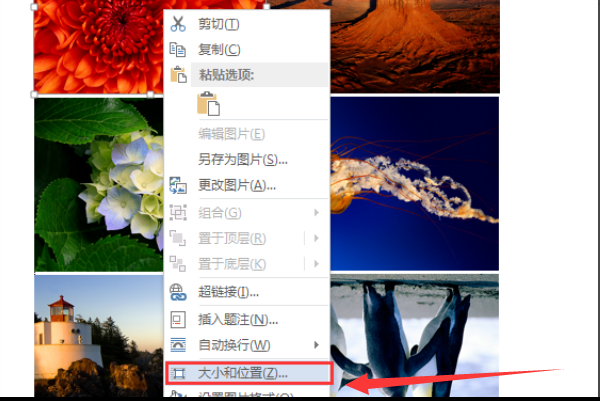 2、鼠标选中图片,找到鼠标右键在弹出的菜单中选择【大小和位置】选项,点击【大小和位置】选项;