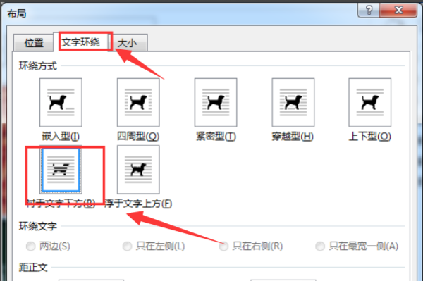 3、然后会弹出一个“大小和位置”弹出框,在弹出框中将图片的“文字环绕”方式设置为“衬于文字下方”;