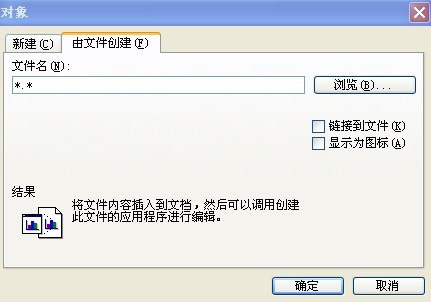 2.弹出“对象”对话框,选择“由文件创建”选项卡,在“文件名”框中输入Excel工作表所在位置,或按〔浏览〕按钮进行选择。选中“链接到文件”复选框,可使插入内容随原Excel表格中的数据的改变而改变,最后按〔确定〕按钮。