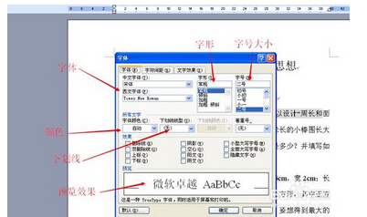 2.第二种方法就是通过菜单栏里的格式——字体按钮,调出字体对话框,如下图,在字体选项下我们可以调节字体、字形、字号、颜色、下划线等