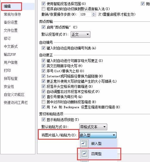 在”选项“窗口中,在”编辑”选项卡下,将插入图片的格式选择为“四周型”,为什么要这么操作,因为我们默认插入图片的方式是嵌入式,使用“选择多个对象”命令时无法选择。