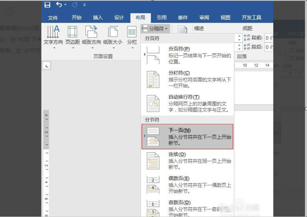 3.点击”页面布局“,然后是”分隔符“,再是”分节符“,最后点击”下一页“,这样的结果是多出了一也空白的