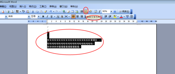 1,选中要旋转的文字,在打印一排工具栏中找到“更改文字方向”点击: