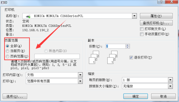 3、在打印属性的设置窗口下可以看到有“页面范围”的选项,可以看到有“全部”、“当前页”和“页面范围”三个选项。