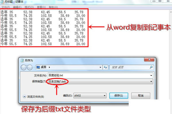 1、首先,打开媒介工具“记事本”,将word文件里需要导入的数据,复制粘贴到记事本当中,然后保存成为txt文件,本例中将txt文件取名为“1.txt”。