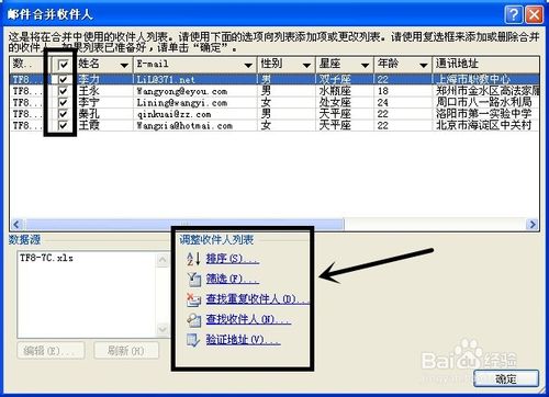 5.点击下一步(选取收件人)---选择收件人,勾中“使用现在列表”,点击“浏览...”(使用来自某文件或数据库的姓名和地址。),选择数据源,找到需要添加的数据源地址---选择表格,的名称SHEET1$,和选中数据首行包含列标题。并点击确定按钮,---选择“邮件合并收件人”把需要的收件人列表勾中,在此不可以调整收件人列表,比如:排序,筛选,查找重复收件人,查找收件人,验证地址---点击确定。